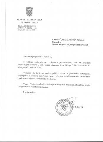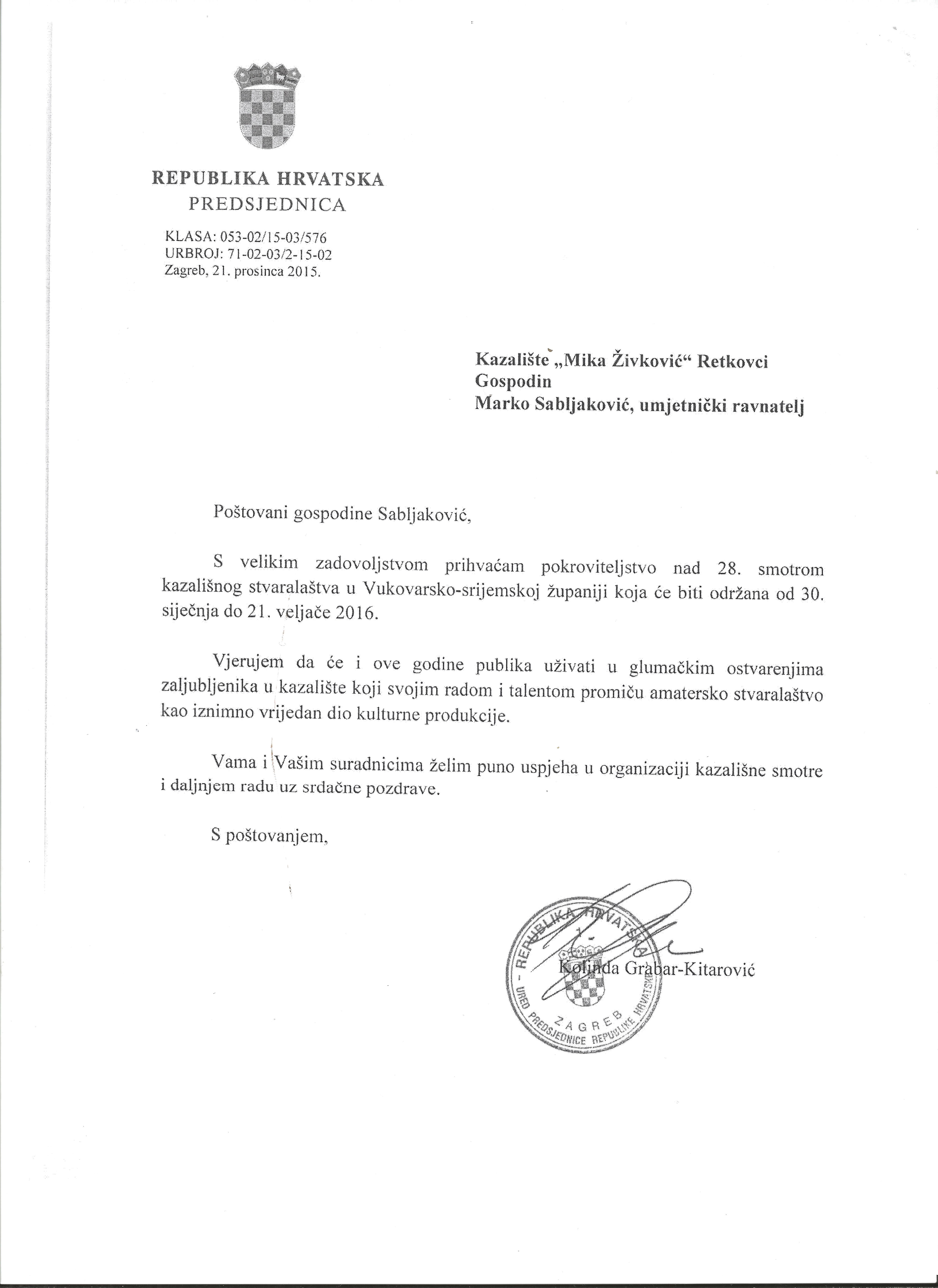 Vama i Vašim suradnicima želim puno uspjeha u organizaciji kazališne smotre i daljnjem radu uz srdačne pozdrave, napisala je u svom pismu Predsjednica RH gđa Kolinda Grabar Kitarović retkovačkom kazalištu "Mika Živković".